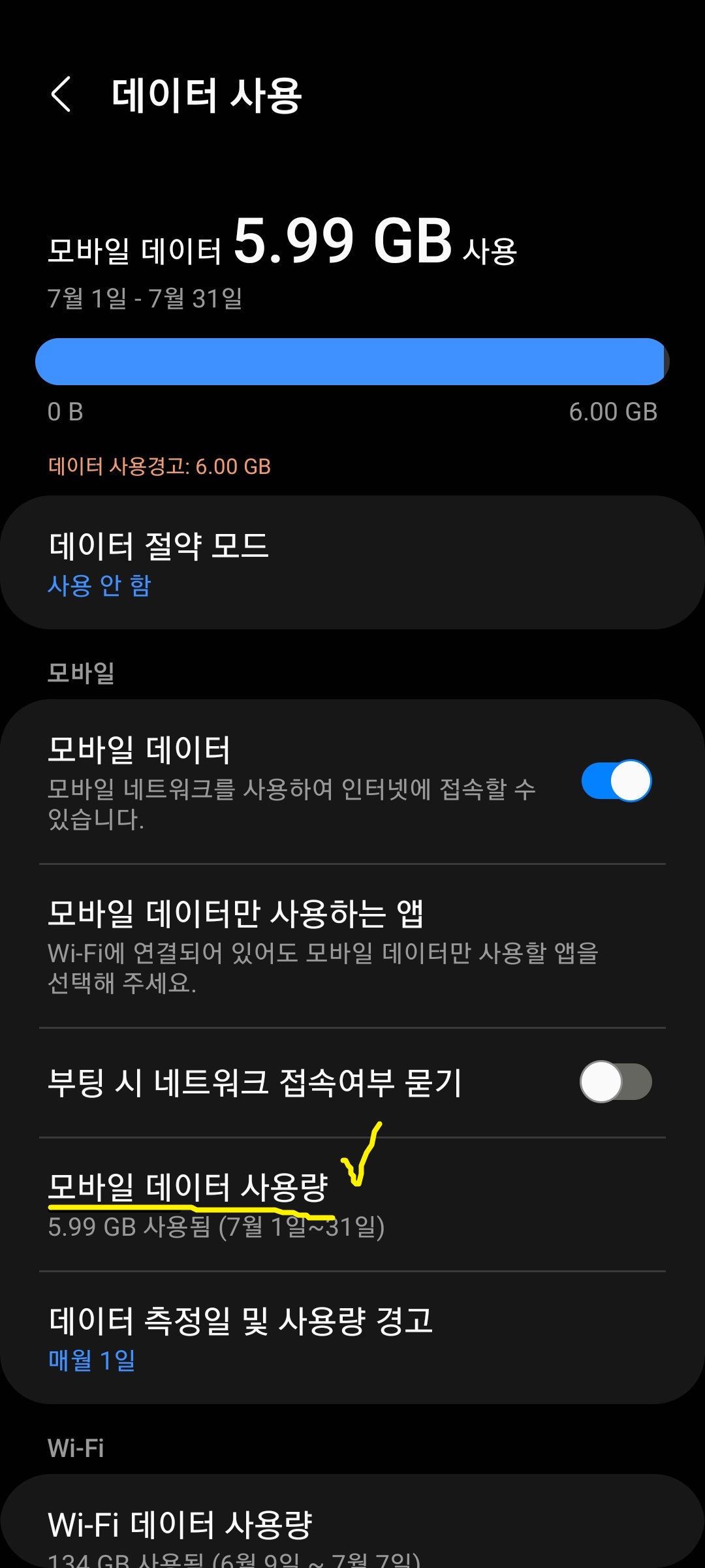 ① 갤럭시 : 연결 > 데이터 사용 > 모바일 데이터 사용량