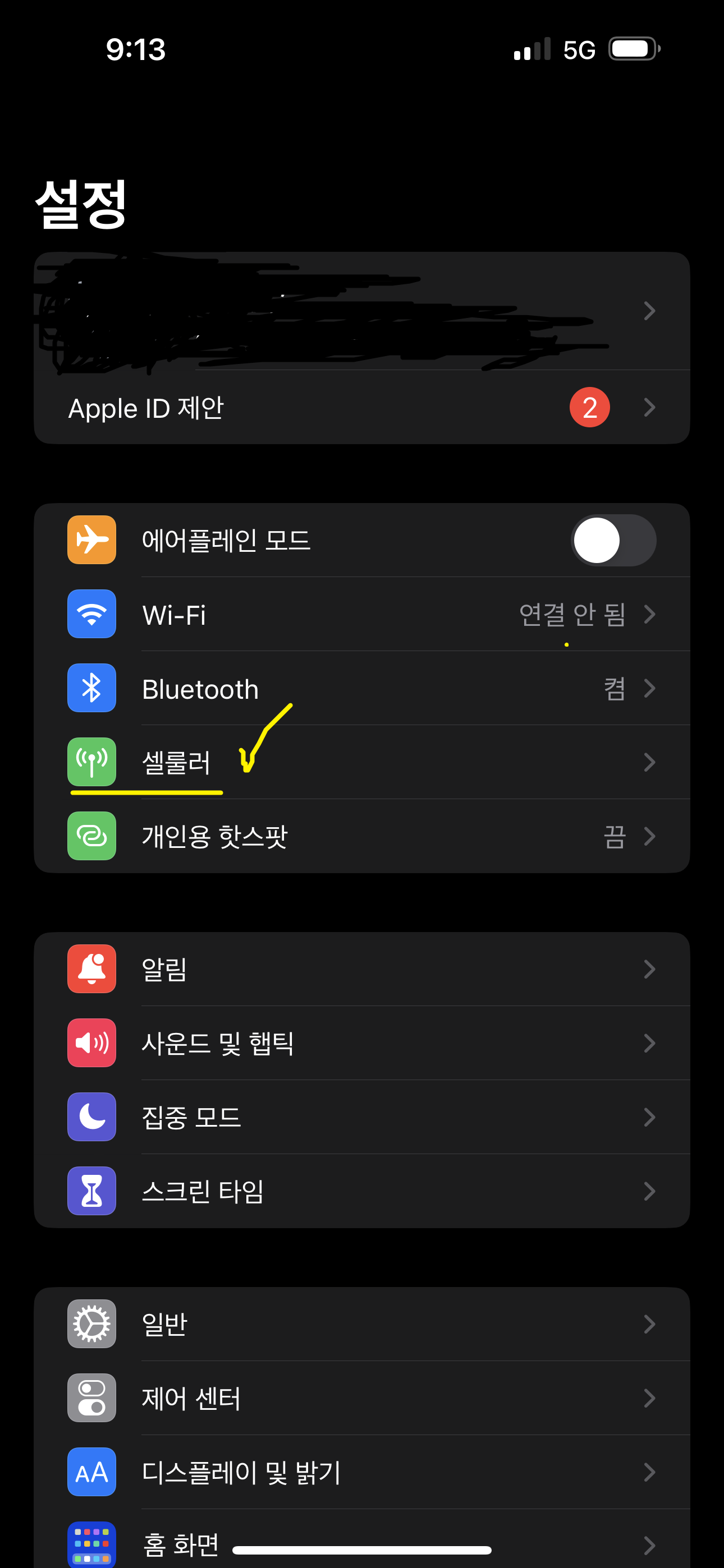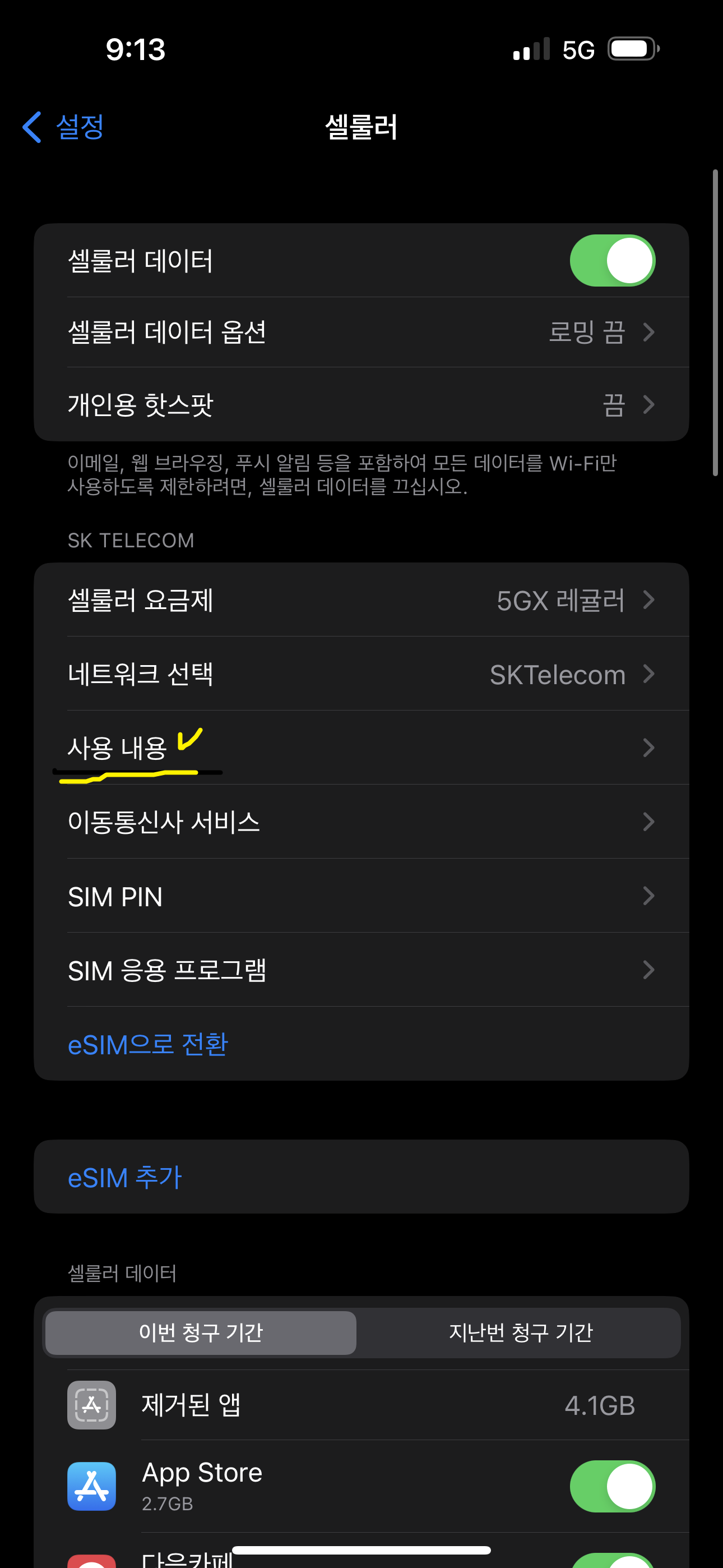② 아이폰 : 셀룰러 > 모바일 데이터(현재 사용량)